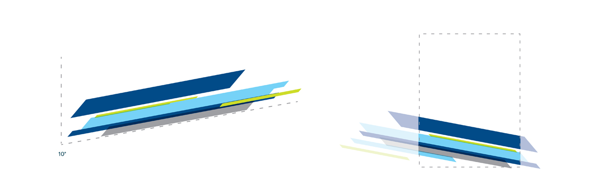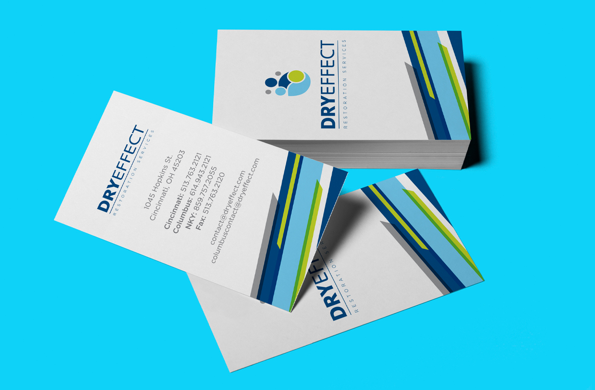The Dry Effect graphic system complements the logo with a series of stacked parallelograms. The shapes reflect the colors of the brand and overlay one another in a random pattern that adds dynamic movement to the brand. The parallelograms reflect the multiple layers of the Dry Effect business.